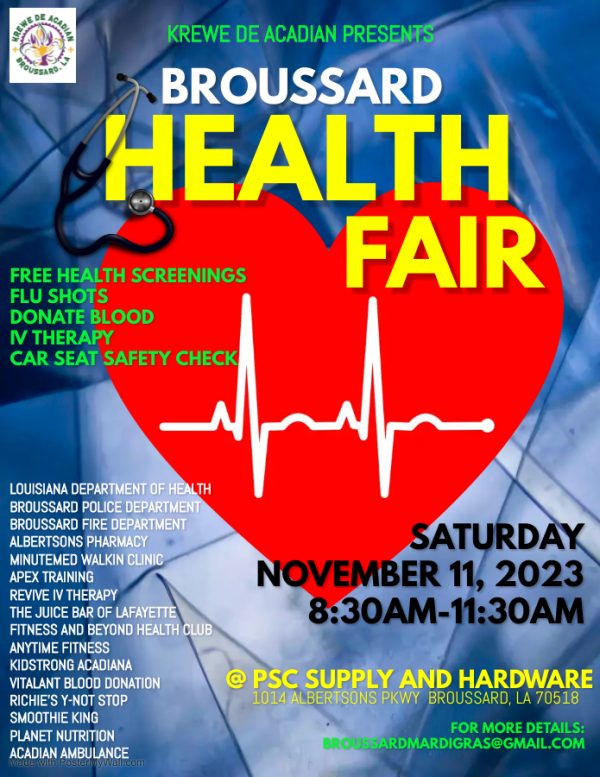 The Krewe de Acadian presents its first event, the Broussard Health Fair. The fair will occur on Saturday, November 11, 2023, from 8:30 a.m. to 11:30 a.m., and is free to attend.