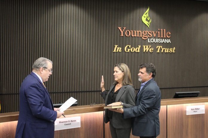 Youngsville resident Sharon Bares was sworn in this afternoon as Council Member Division A on the Youngsville City Council. Bares was victorious in last Saturday’s special election to fill the unexpired term of former council member Kayla Menard-Reaux, who resigned from the seat in April of 2023.
