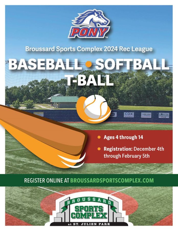 The Broussard Sports Complex 2024 Rec League is registering for Baseball, Softball, and T-Ball for ages four through fourteen from December 5, 2023, through February 5, 2024.