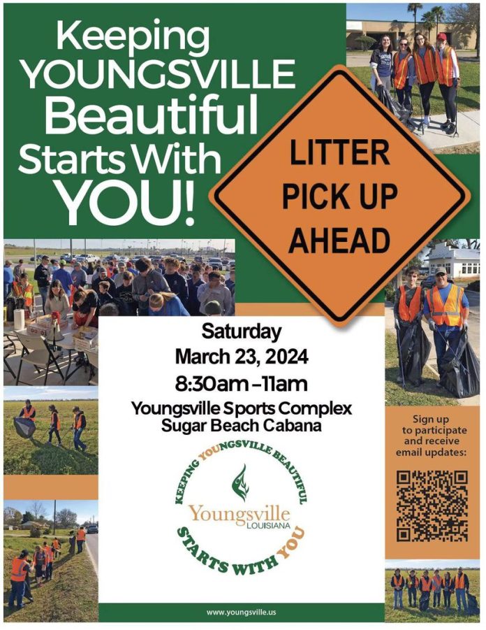 YOUNGSVILLE, LA (Mar. 20, 2024) – Youngsville is having its annual litter pickup day on Saturday, March 23, 2024, from 8:30 to 11 a.m. Volunteers are asked to meet at the Sugar Beach Cabana at the Youngsville Sports Complex.