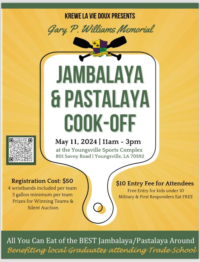Krewe La Vie Doux will hold a Jambalaya and Pastalaya Cook-Off on Mother’s Day, May 11, 2024, from 11 a.m. to 3 p.m. The cook-off will be held at Youngsville Sports Complex, located at 801 Savoy Road in Youngsville, Louisiana.