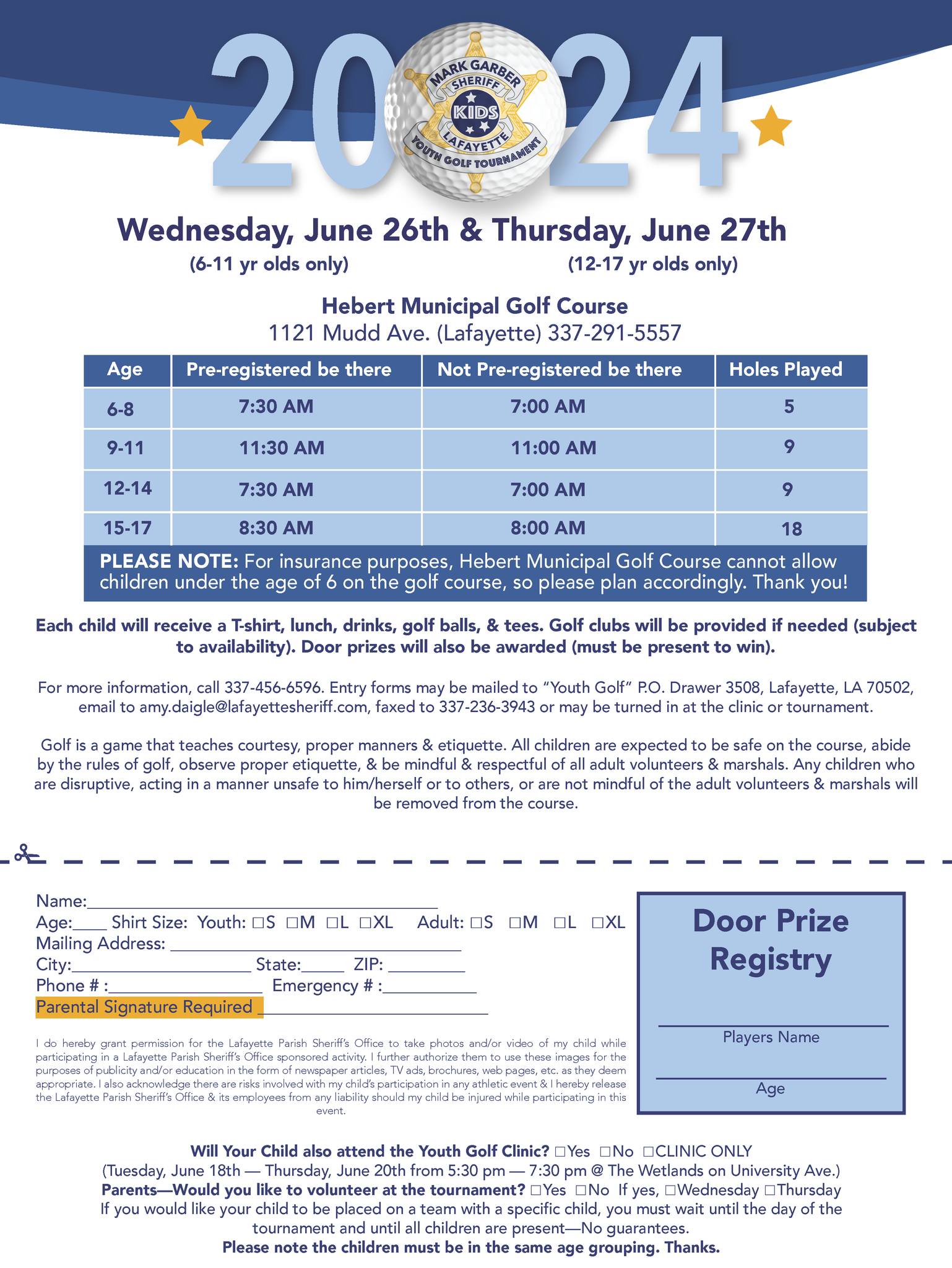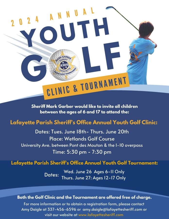 Lafayette Parish Sheriff Mark Garber is inviting all children between the ages of six and seventeen to attend the 2024 Annual Youth Golf Clinic & Tournament in June 2024. The dates are located on the flyer.