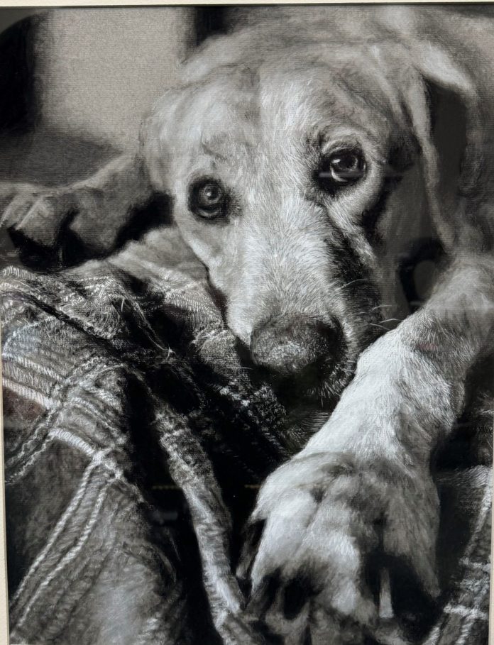 Cole’s piece, titled “Rocket Lying on The Bed,” is a black and white charcoal drawing of his dog Rocket lying on his parents’ bed on a plaid blanket.