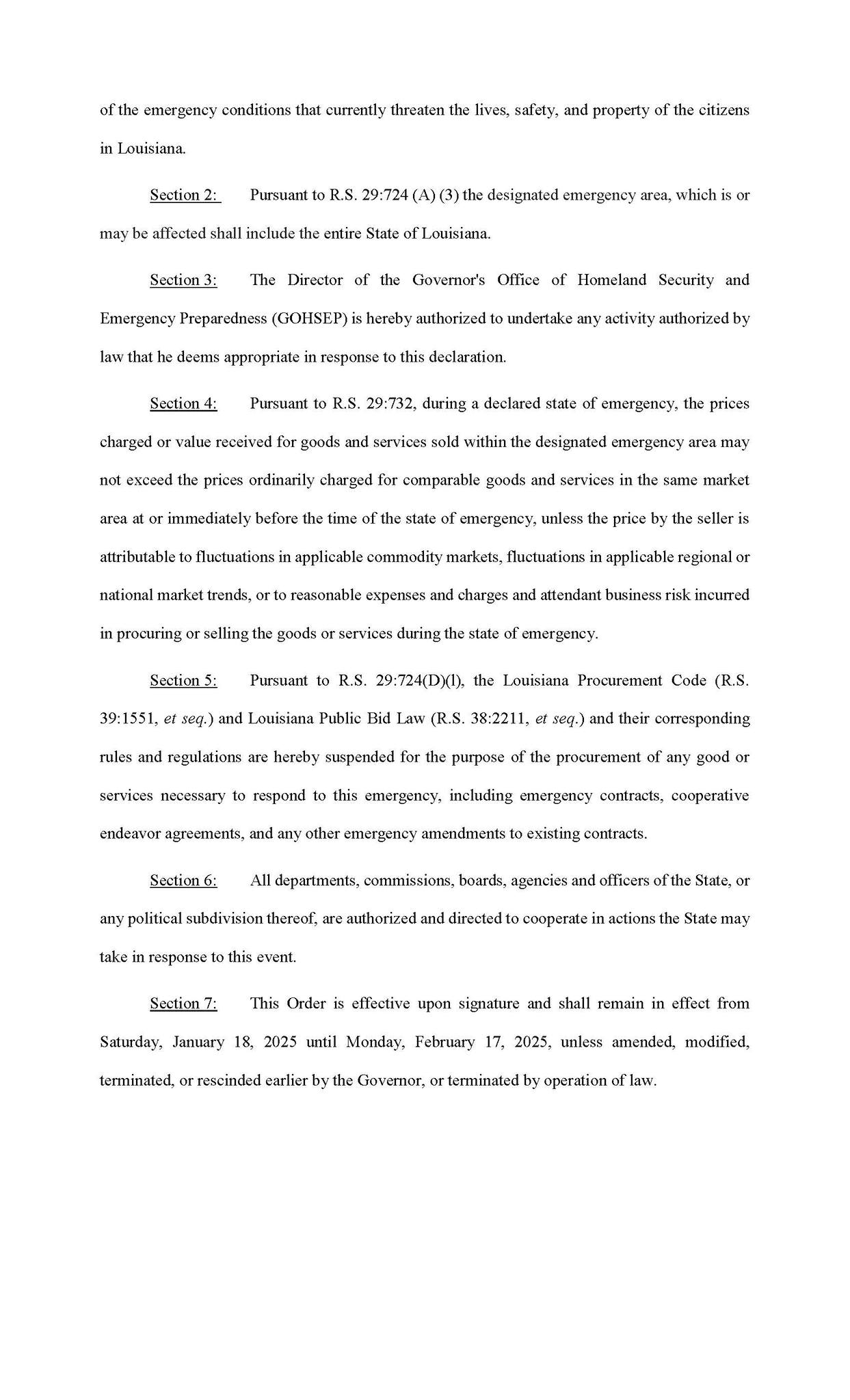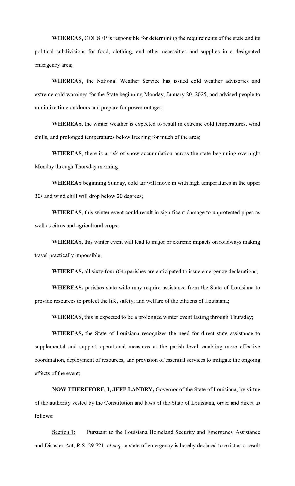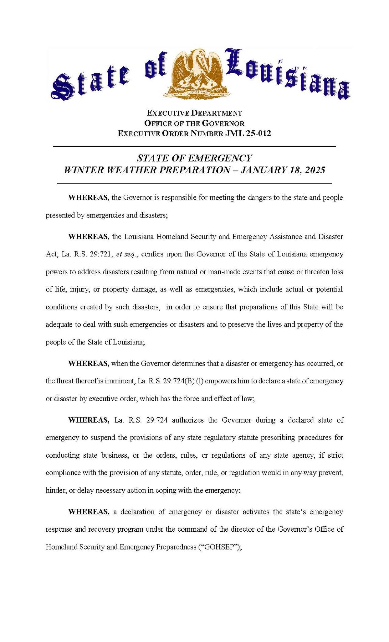 Baton Rouge, LA (January 18, 2025) – Governor Jeff Landry issued a State of Emergency today in preparation for the winter weather expected to hit Louisiana.