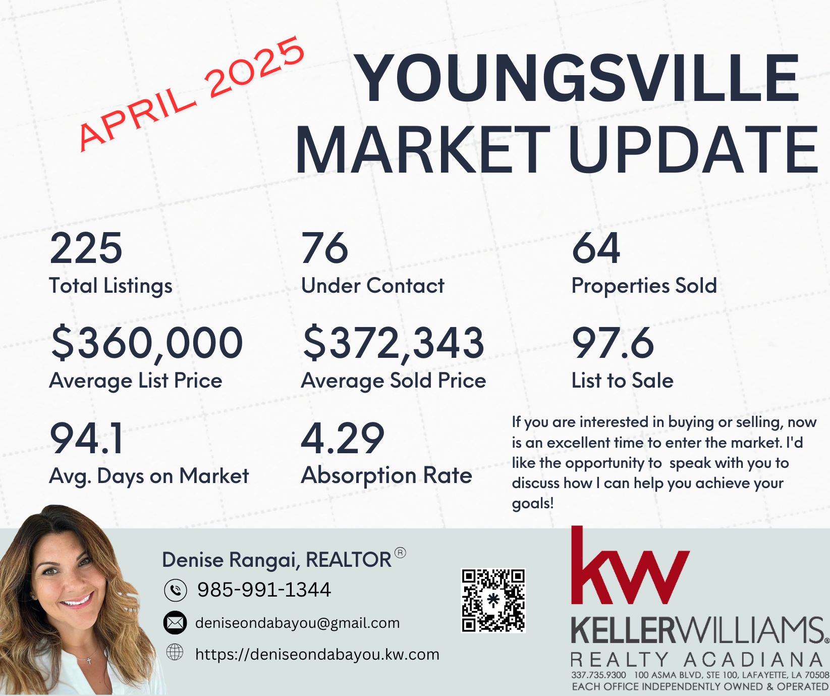 Broussard / Youngsville, LA (May 9, 2025) – While the national housing market continues to face challenges in April 2025, such as elevated mortgage rates, affordability concerns, and longer selling timelines, the Acadiana region shows signs of resilience, particularly in Youngsville and Broussard.