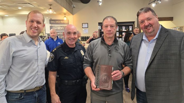 Pictured from left to right: Louisiana State Representative Josh Carlson of District 43, Broussard Police Chief Vance Olivier, Bourque, and Hoke.
