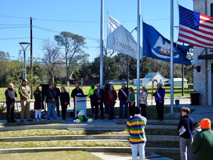 YOUNGSVILLE, LA (January 6, 2025) – The City of Youngsville kicked off the 2025 Mardi Gras Season with its Annual Flag Raising Ceremony. The city celebrated with its Youngsville Mardi Gras Krewes, Krewe Des Amis and Krewe La Vie Doux.