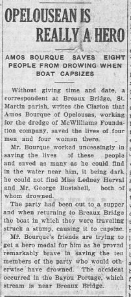 “Without giving time and date, a correspondent at Breaux Bridge, St. Martin Parish, writes the Clarion that Amos Bourque of Opelousas, working for the dredge of McWilliams Foundation Company, saved the lives of four men and four women there.