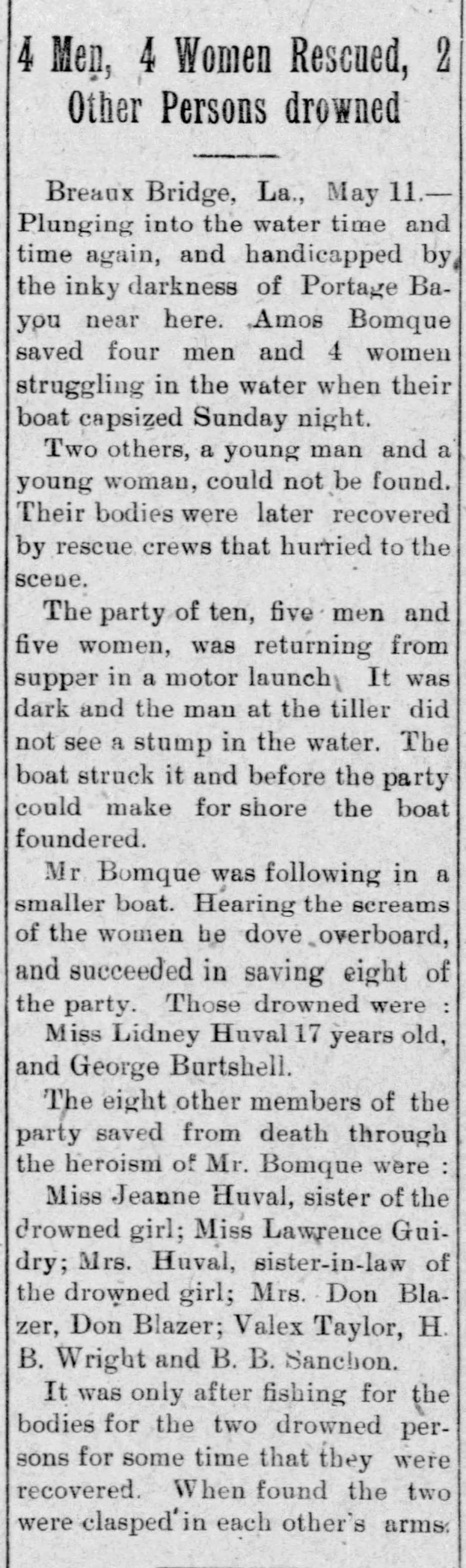 Mr. Bourque’s friends are trying to get a hero medal for him as he proved remarkably brave in saving the ten2 members of the party who would have otherwise drowned. The accident occurred at Bayou Portage, which steam is near Breaux Bridge.”