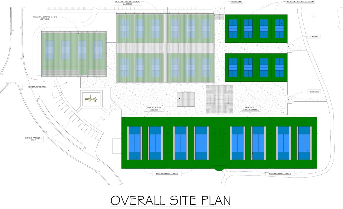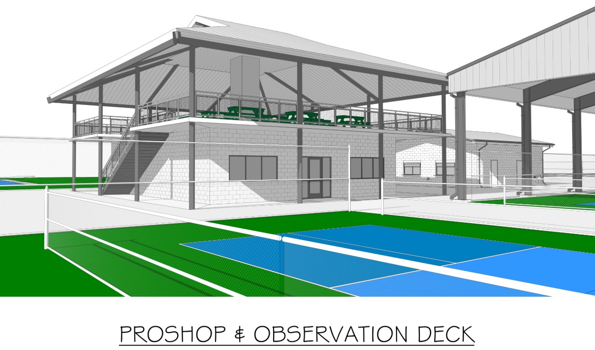 The tennis/pickleball facility will enhance the eight existing tennis courts by adding 24 pickleball courts, a concession stand, a pro shop, and an elevated balcony. A total of 16 of the 24 pickleball courts will be covered, with overhead fans and lighting. The tennis/pickleball facility is designed by Trahan Architecture + Planning, LLC, of Lafayette.