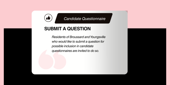 Residents of Broussard and Youngsville who would like to submit a question for possible inclusion in the candidate questionnaires are invited to do so. Questions may be emailed to CandidateQuestions@bylocalnews.com.